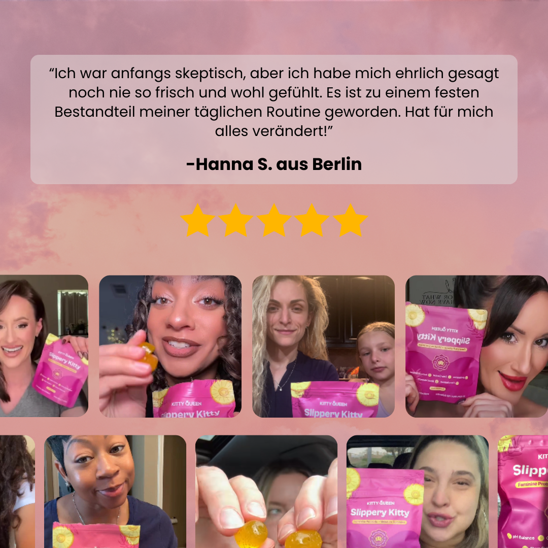 Slippery Kitty kombiniert aktive Probiotika und präbiotische Faser in einem leckeren Daily Gummy. Zwei am Tag genügen, um die Balance zu unterstützen und das Wohlgefühl im Intimbereich zurückzubringen. Für mehr Frische, mehr Sicherheit und mehr von diesem confident nasty Feeling.